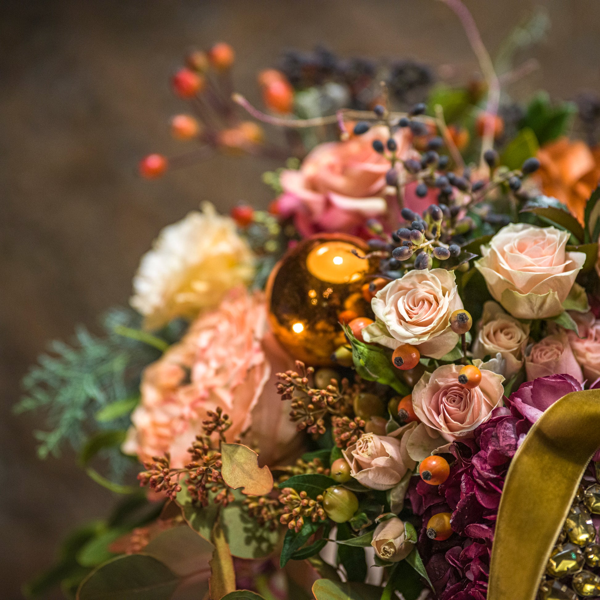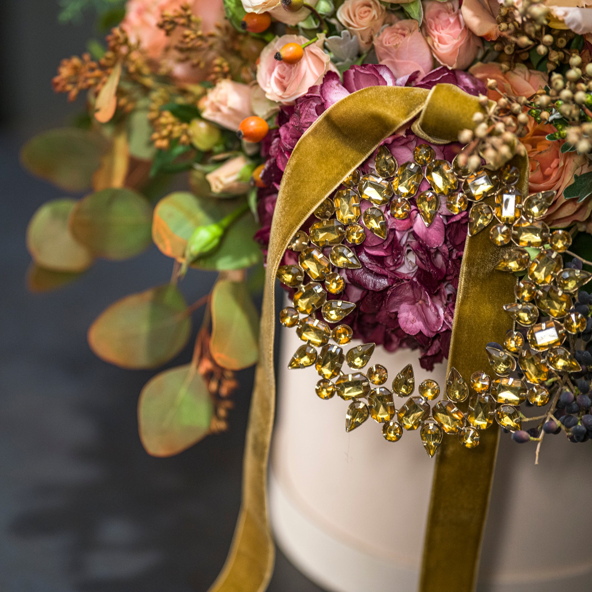 Beige, burgundy, festive tall flower box with roses, hydrangea, eucalyptus, lisianthus, various berries. Excellent gift, for anniversaries, Christmas, a universal surprise.